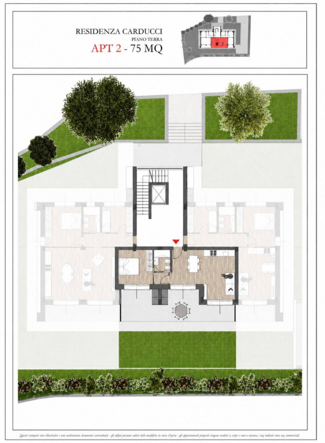 All'interno della residenza, l'unità proposta APT 2 è un bilocale di 75 mq commerciali al piano terra, dotato di solarium di circa 38 mq e giardino ad uso esclusivo di circa 40 mq.