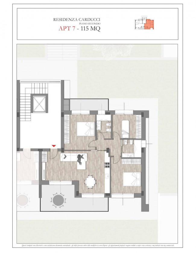 All'interno della residenza, l'unità proposta APT 7 è un quadrilocale di 115 mq commerciali al piano secondo, dotato di terrazzo solarium.